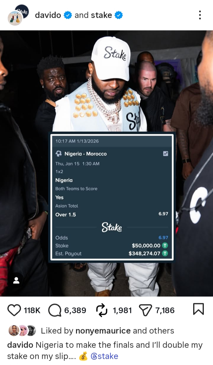 Prominent singer, Davido breaks silence after he lost a whopping $348K (N495 million) after the Nigerian Super Eagles got defeated by Morocco in the 2026 AFCON.